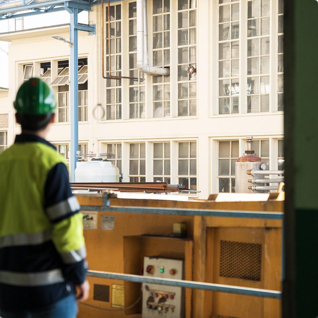 The custom logotype, built with a geometric typeface, echoes the pipes and reactors of the production plant, creating a tangible link between the brand and its industrial origin.